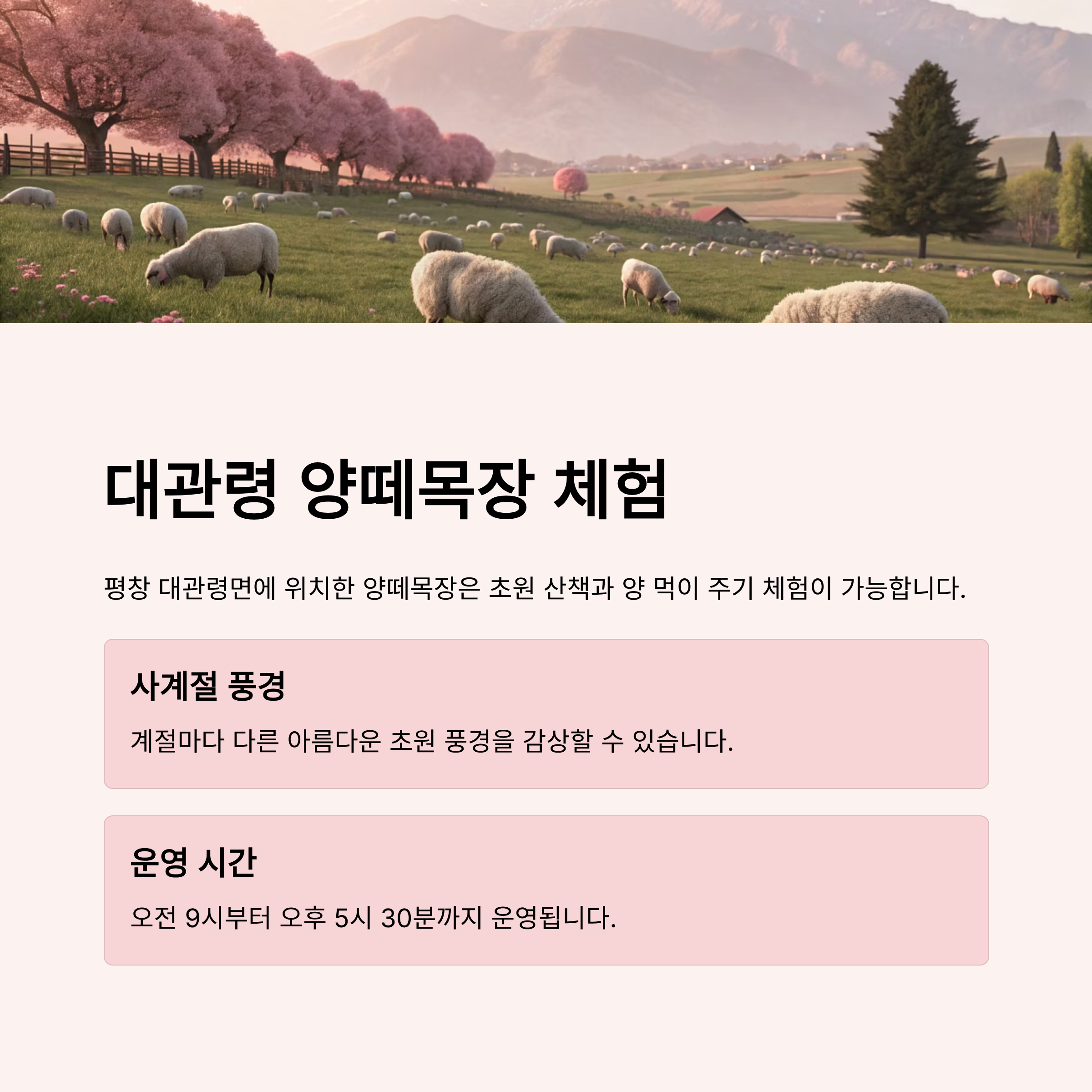 평창 대관령면에 위치한 양떼목장은 초원 산책과 양 먹이 주기 체험이 가능합니다.