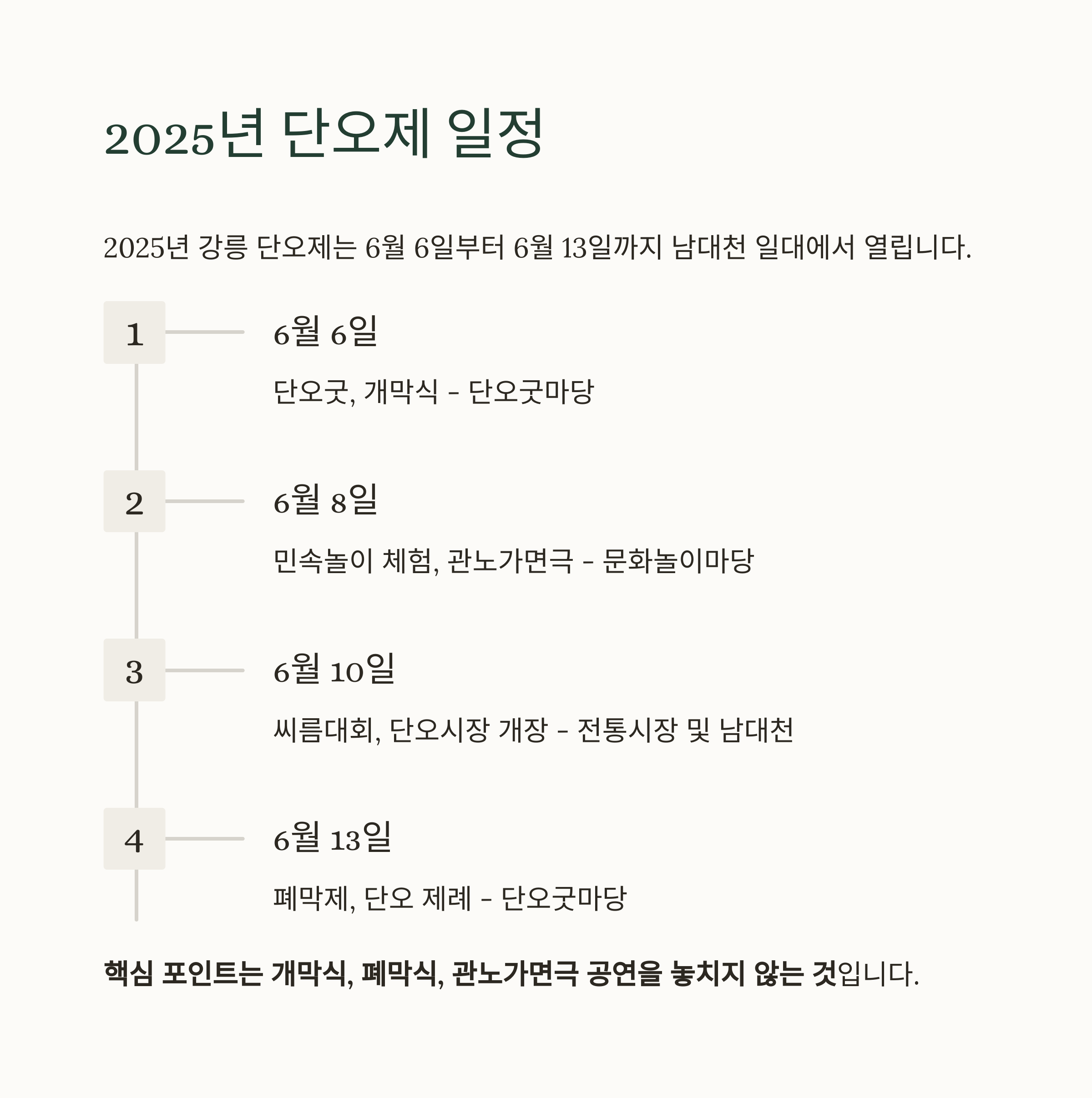 2025년 강릉 단오제는 6월 6일부터 6월 13일까지 남대천 일대에서 열립니다.
