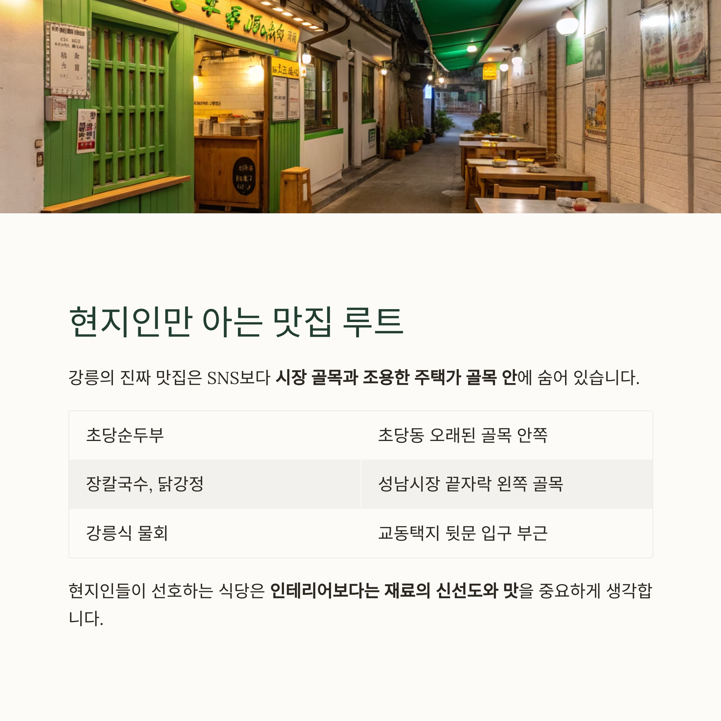 강릉의 진짜 맛집은 SNS보다 시장 골목과 조용한 주택가 골목 안에 숨어 있습니다.
