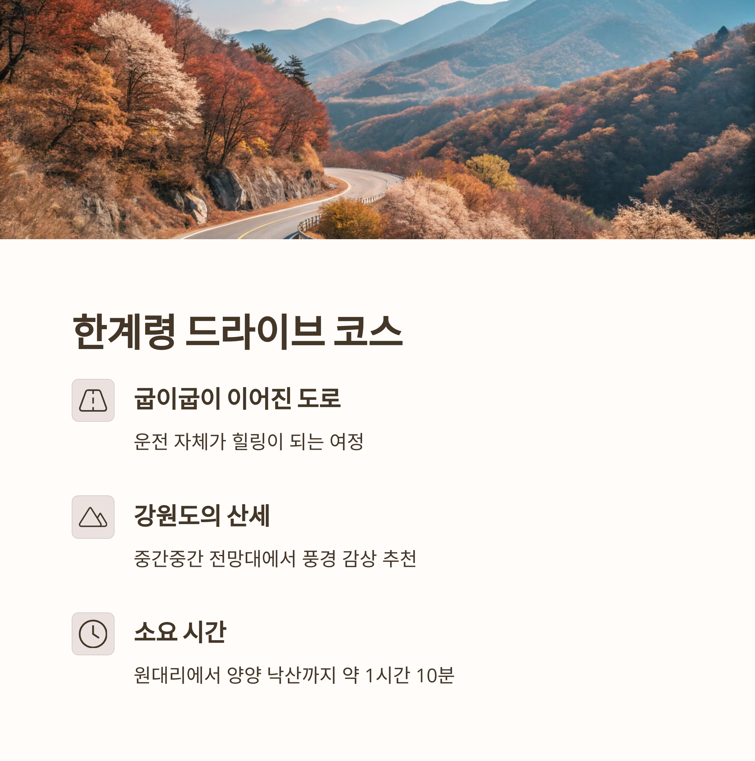 이 코스는 굽이굽이 이어진 도로와 강원도의 산세를 감상할 수 있어