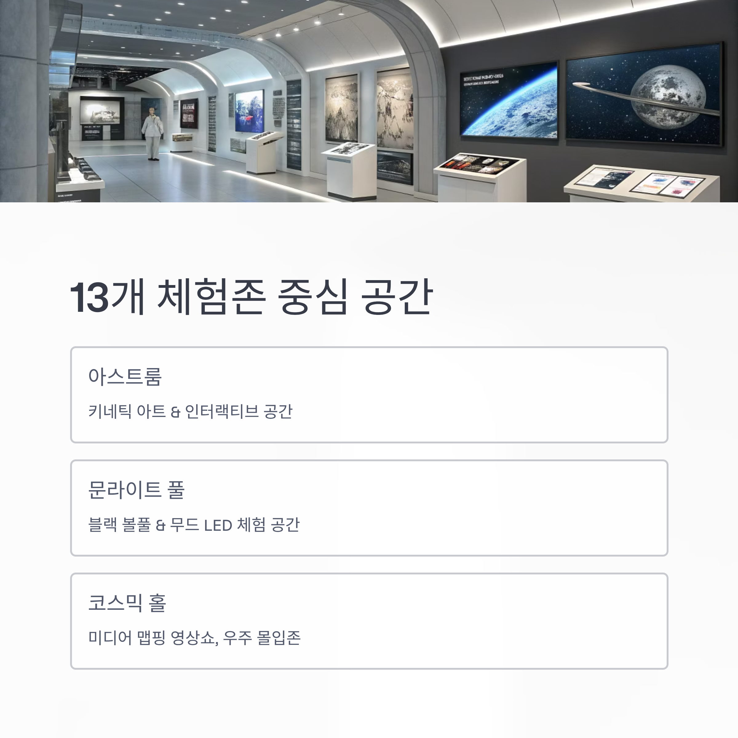 각 전시존은 우주·SF 세계관을 테마로 꾸며졌습니다.
