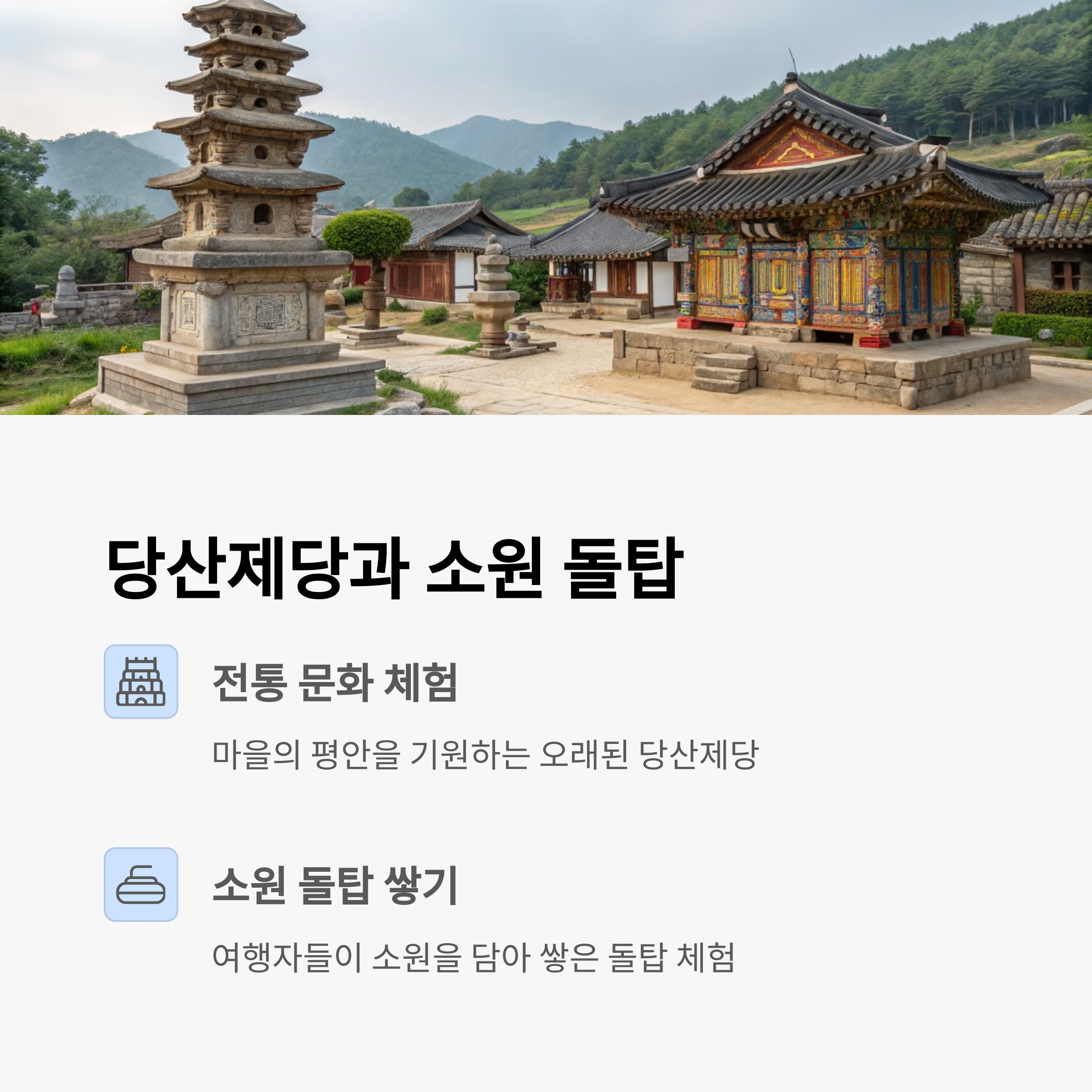 제당 옆에는 주민들과 여행자들이 소원을 담아 쌓은 돌탑이 줄지어 있으며,