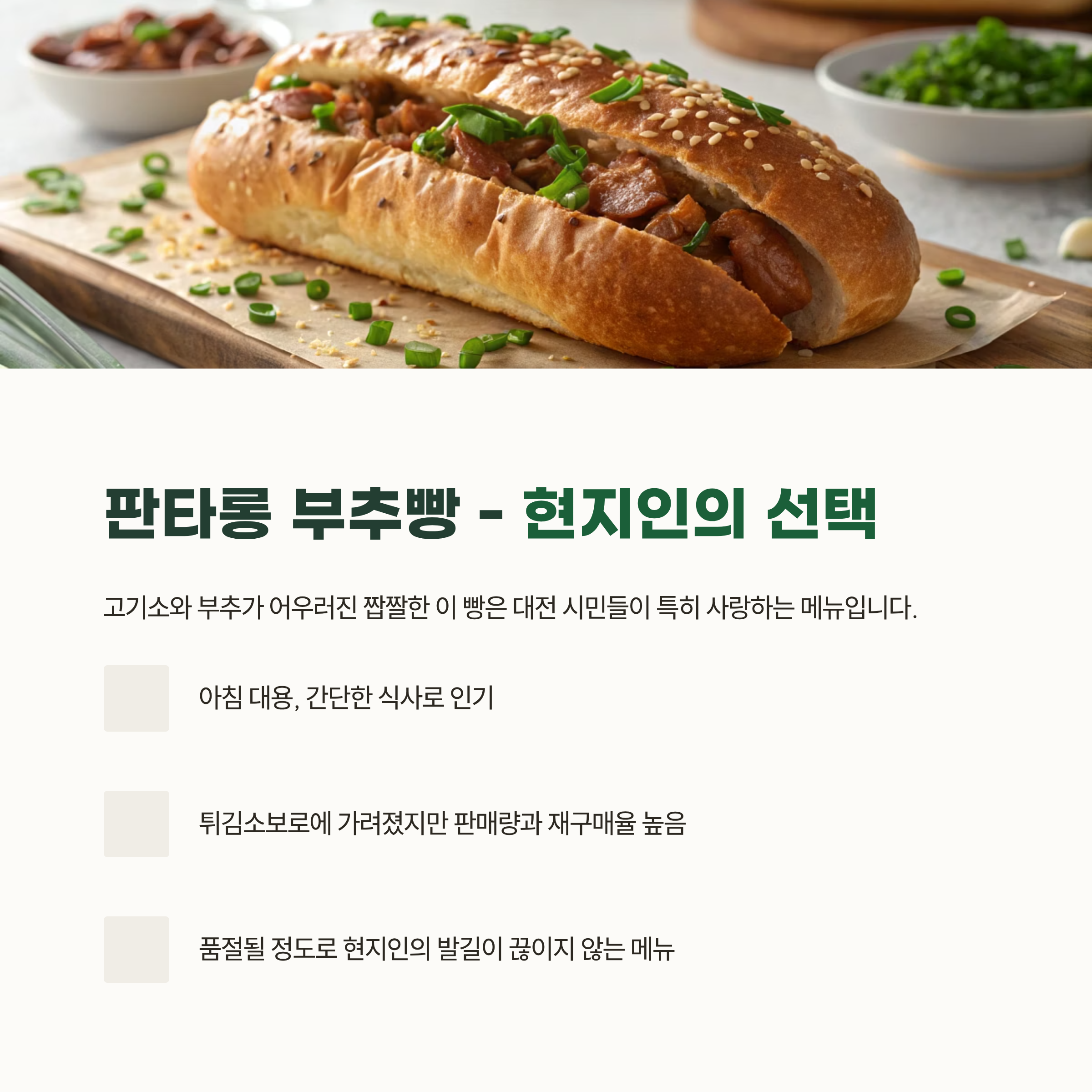 | 판타롱 부추빵 | 짭짤+고소 | 식사 대용, 현지 강추 |
