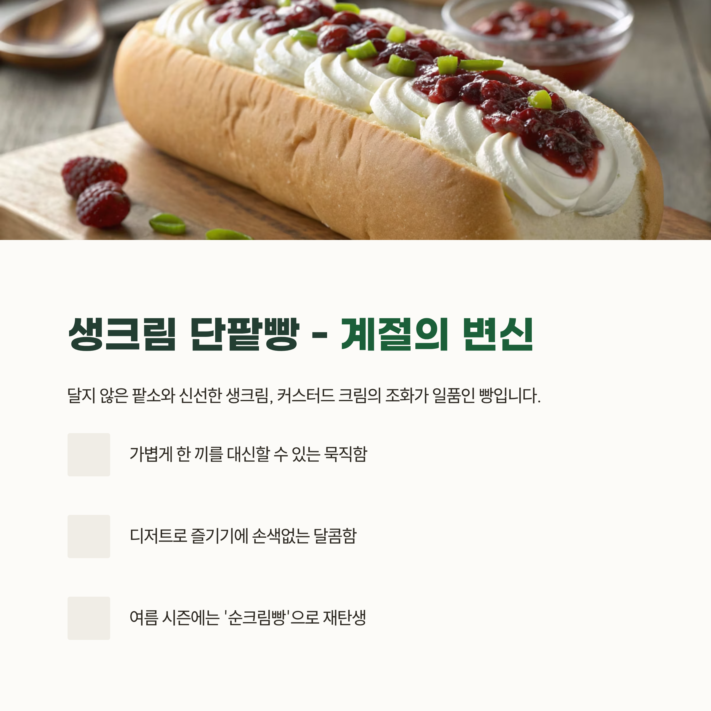 | 생크림단팥빵 | 부드러운 크림+달콤한 팥 | 디저트, 계절 한정 메뉴 |