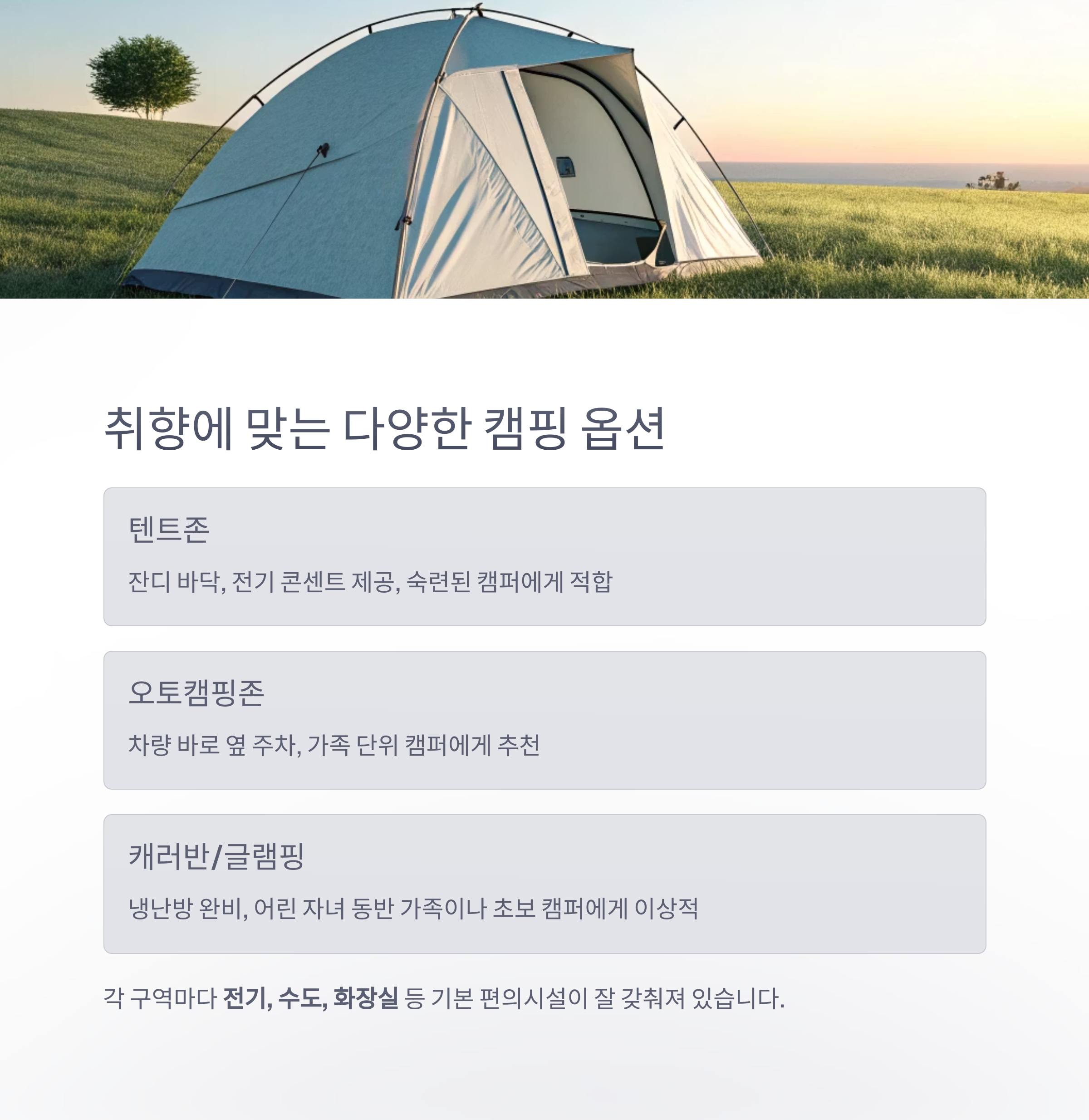 | 글램핑존 | 침구 제공, BBQ 세트 제공 가능 | 초보 캠퍼, 연인 |