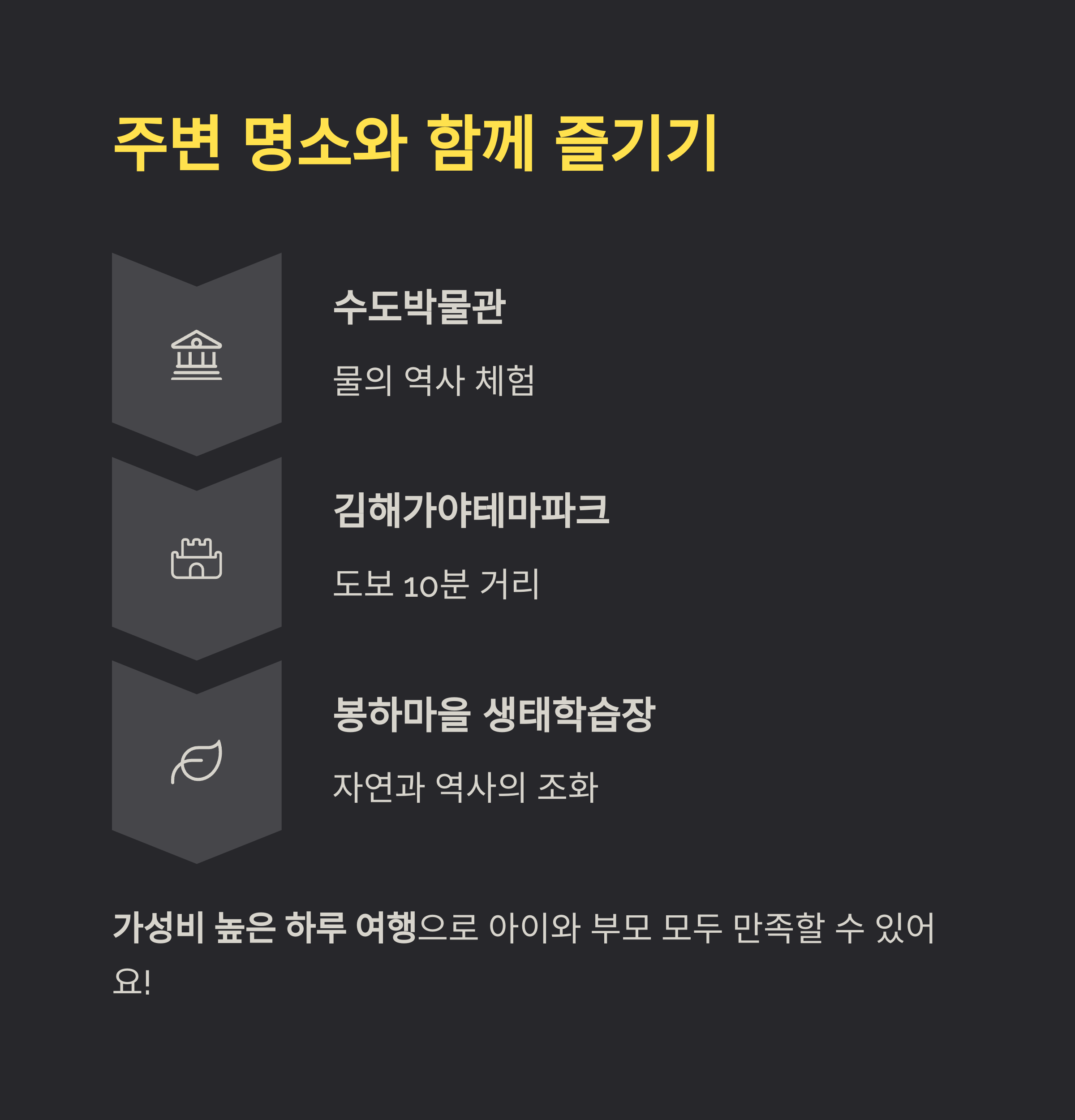 부모도 만족할 수 있는 가성비 높은 하루 여행이 됩니다.