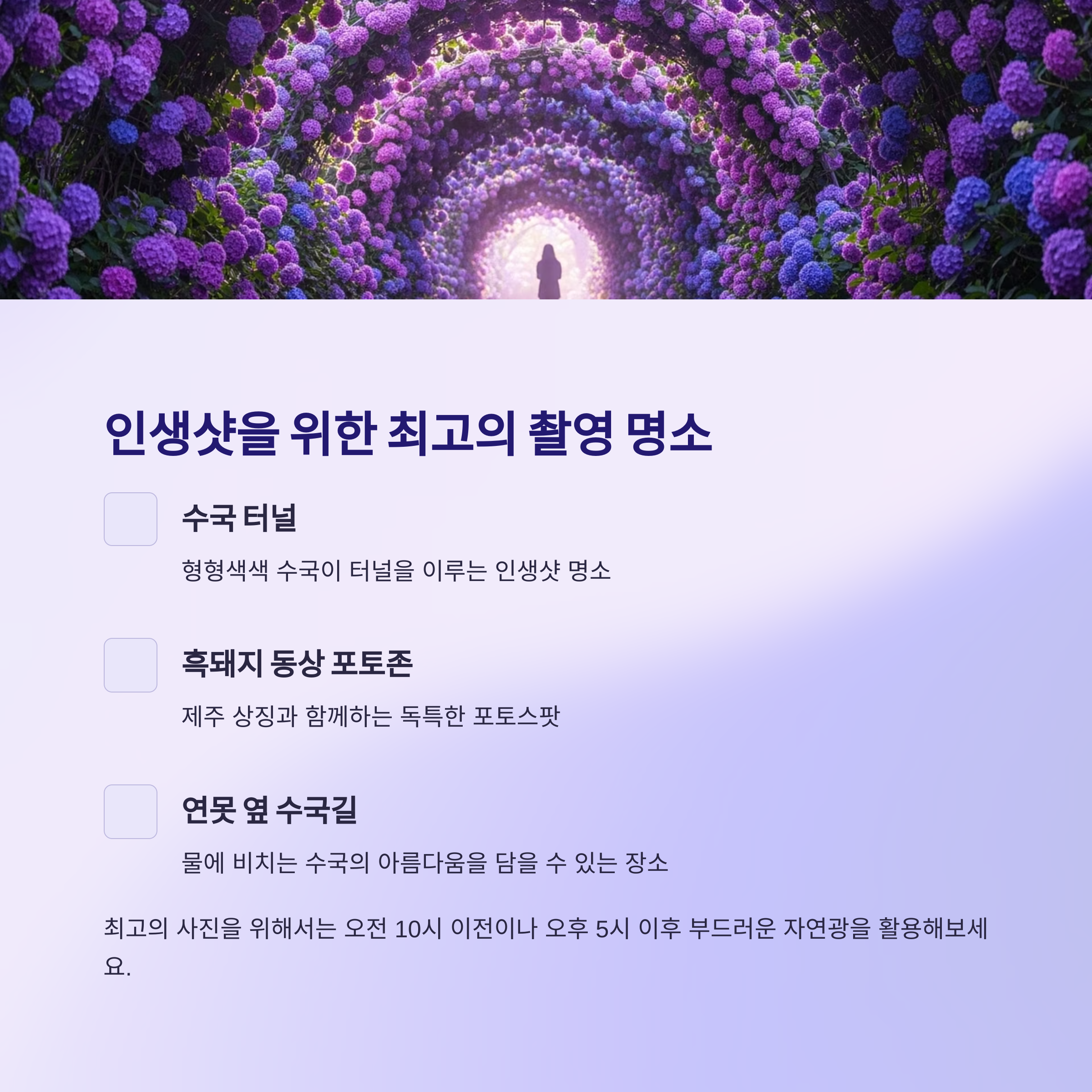 ‘수국 터널’, ‘흑돼지 동상 포토존’, ‘연못 옆 수국길’이