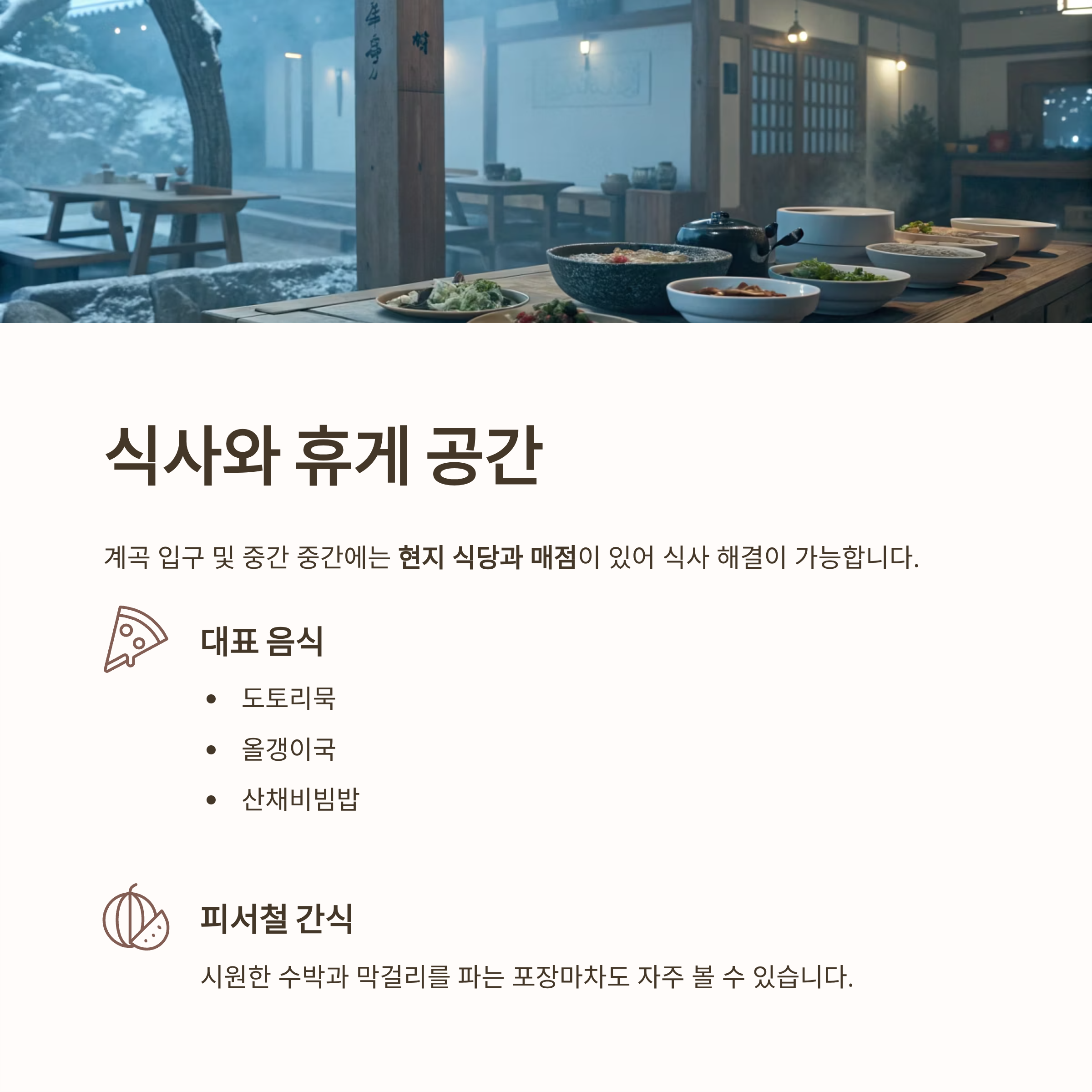 계곡 입구 및 중간 중간에는 현지 식당과 매점이 있어 식사 해결이 가능합니다.