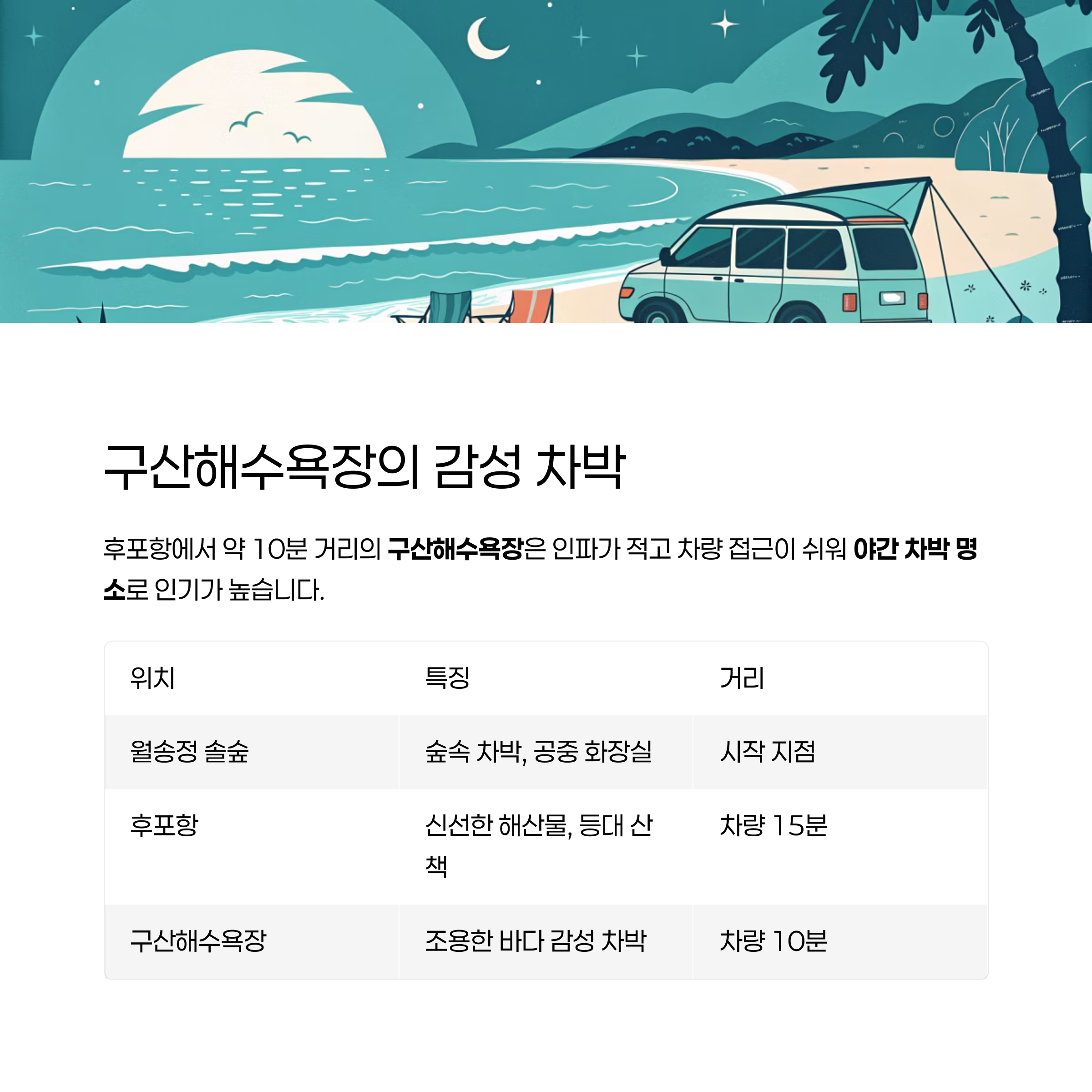 | 구산해수욕장 | 조용한 바다 감성 차박 | 차량 10분 |