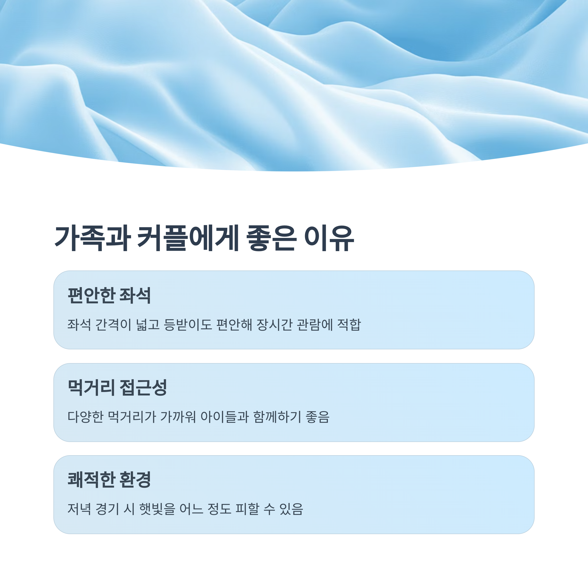 "가족이랑 갔는데 좌석도 편하고 먹거리도 가까워서 만족!"