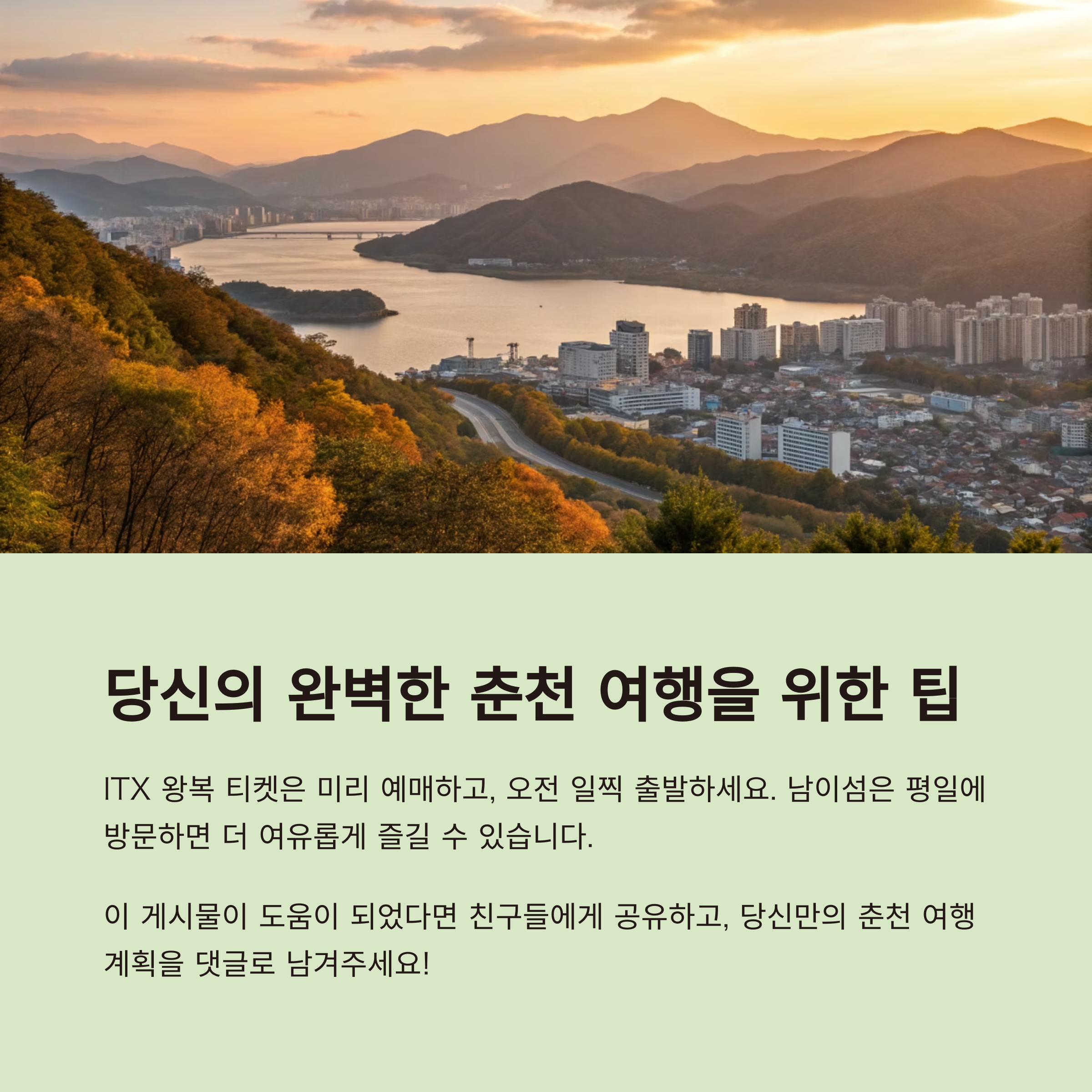 "ITX 왕복 티켓 미리 예매 → 오전 일찍 출발 → 남이섬은 평일 방문"을 추천합니다.