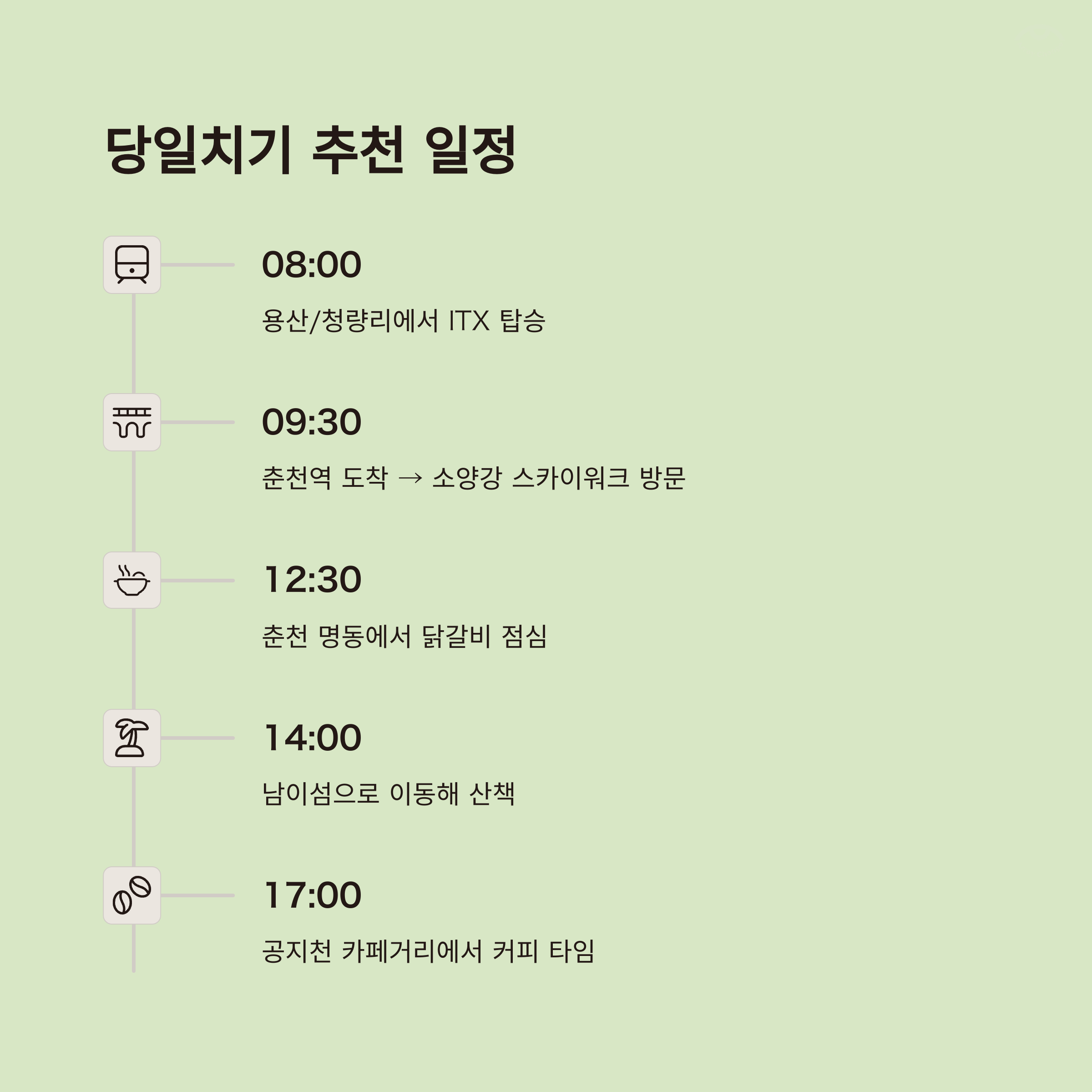 춘천에 도착한 뒤엔 다양한 자연 명소와 도시 감성 여행지가 기다리고 있습니다.