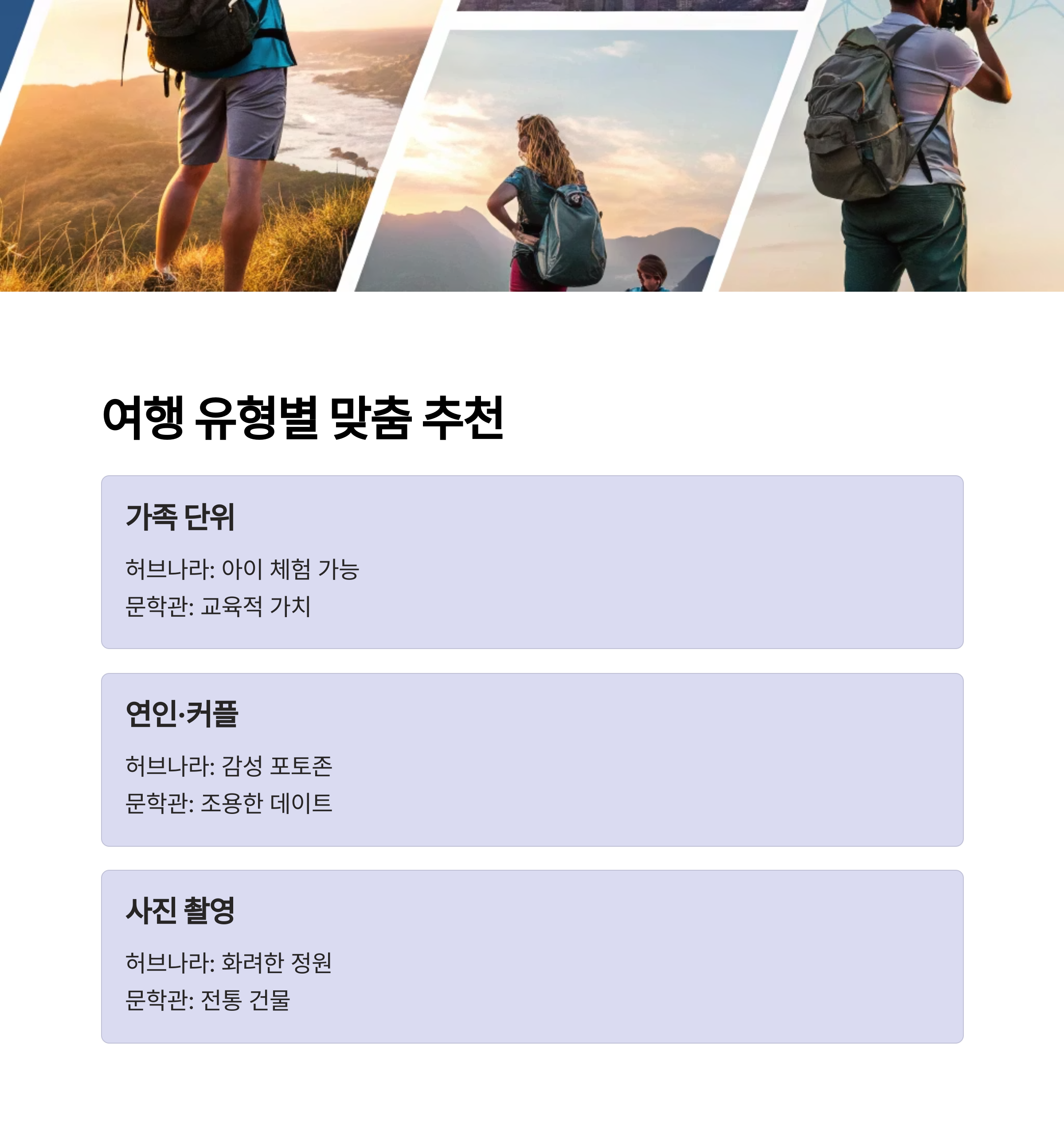 각 장소의 추천 포인트와 대상층을 아래와 같이 비교해봅니다.
