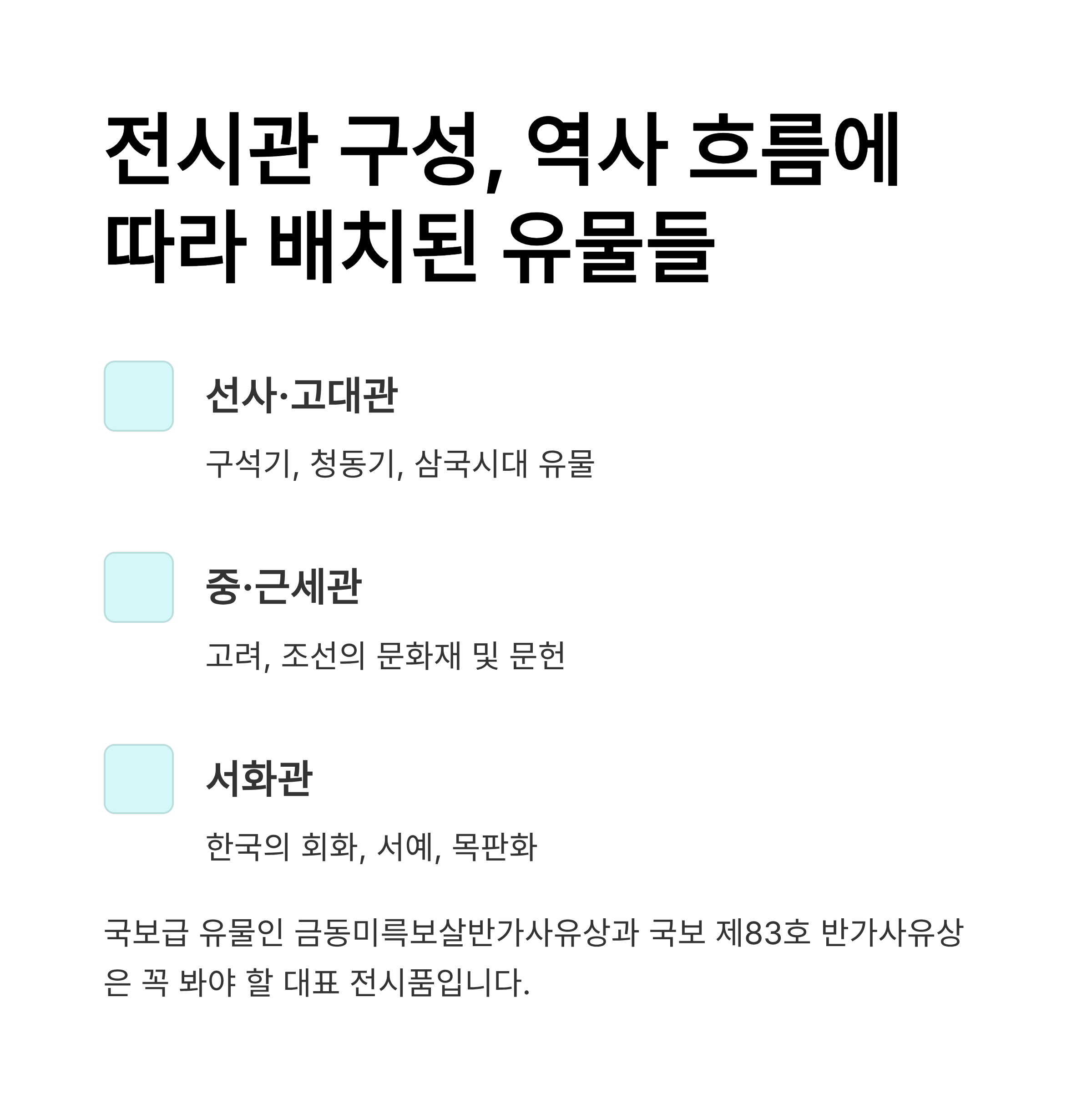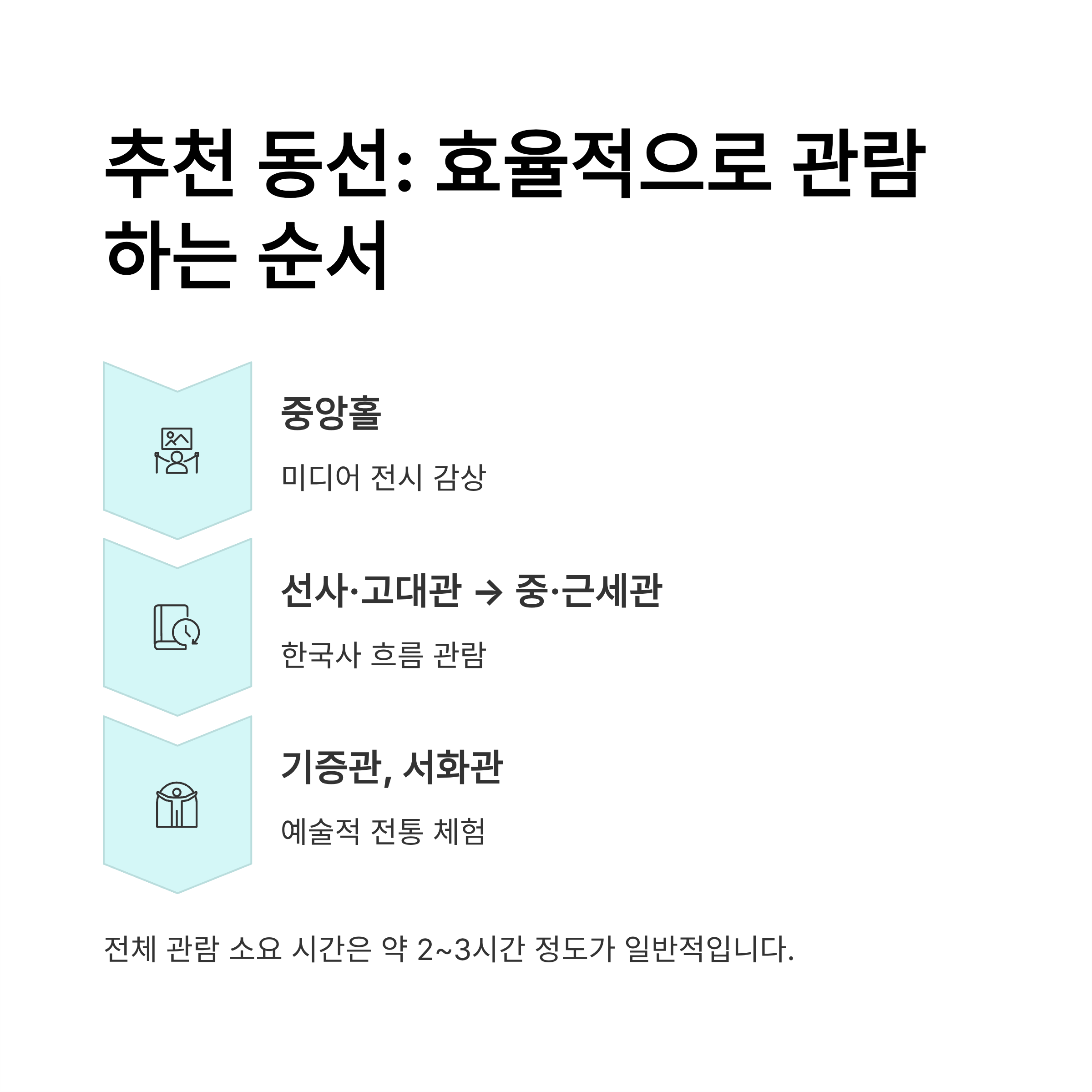 - 선사·고대관 → 중·근세관으로 한국사 흐름 관람