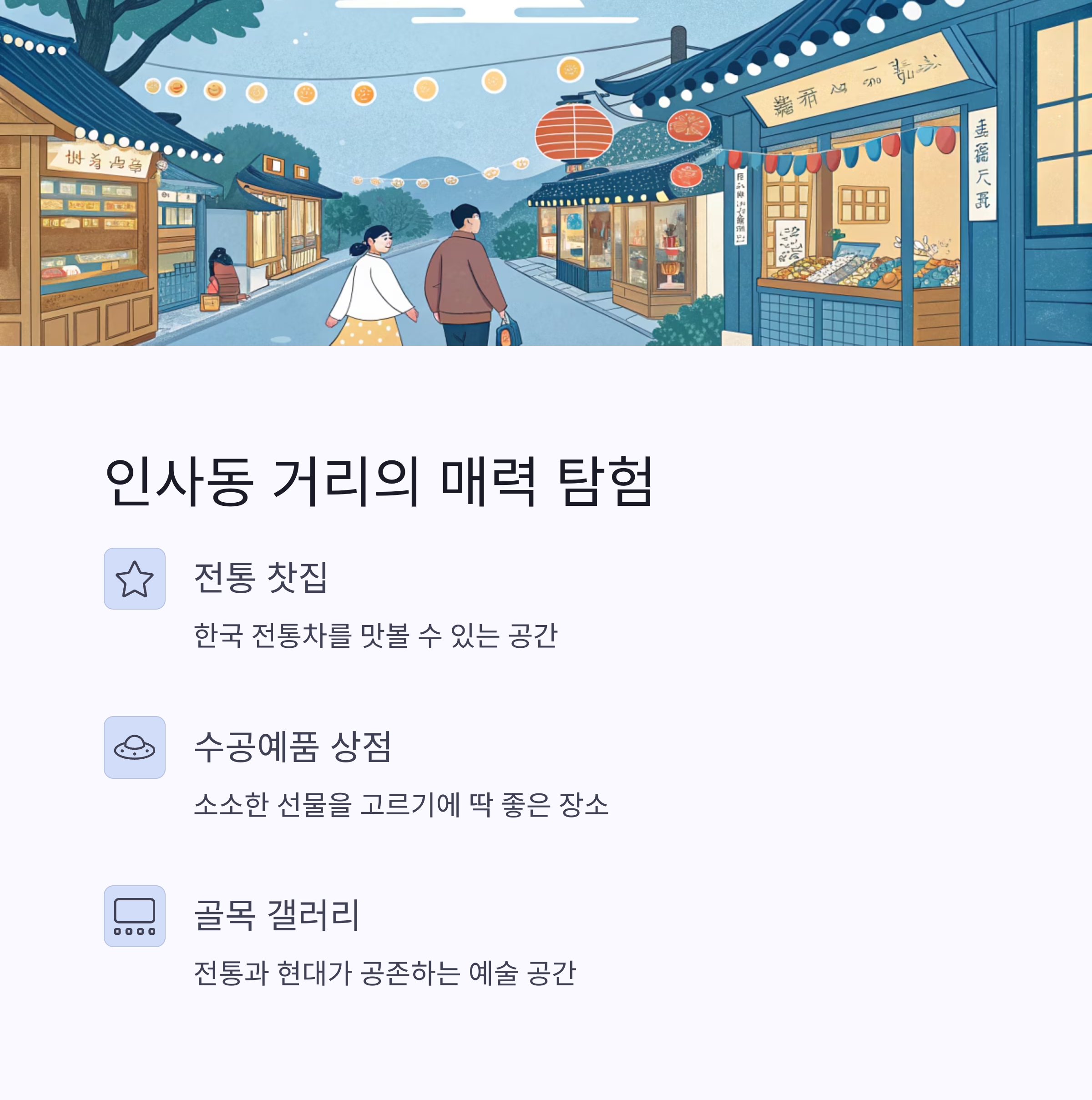 | 인사동 거리 | 쇼핑, 감상 | 약 1시간 | 오후 3시 |