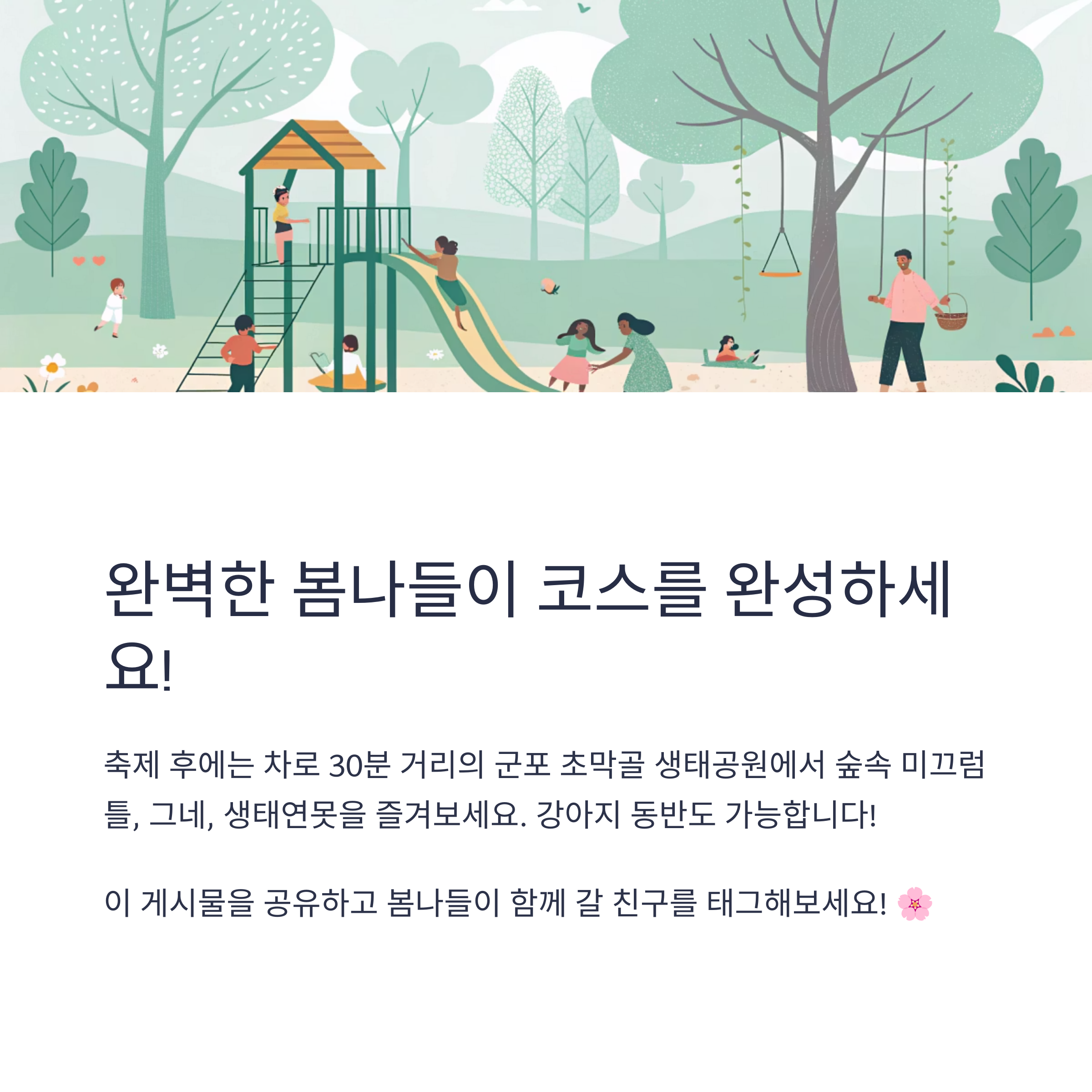 꽃길과 놀이터, 체험과 산책이 어우러진 완벽한 주말 코스가 완성됩니다.