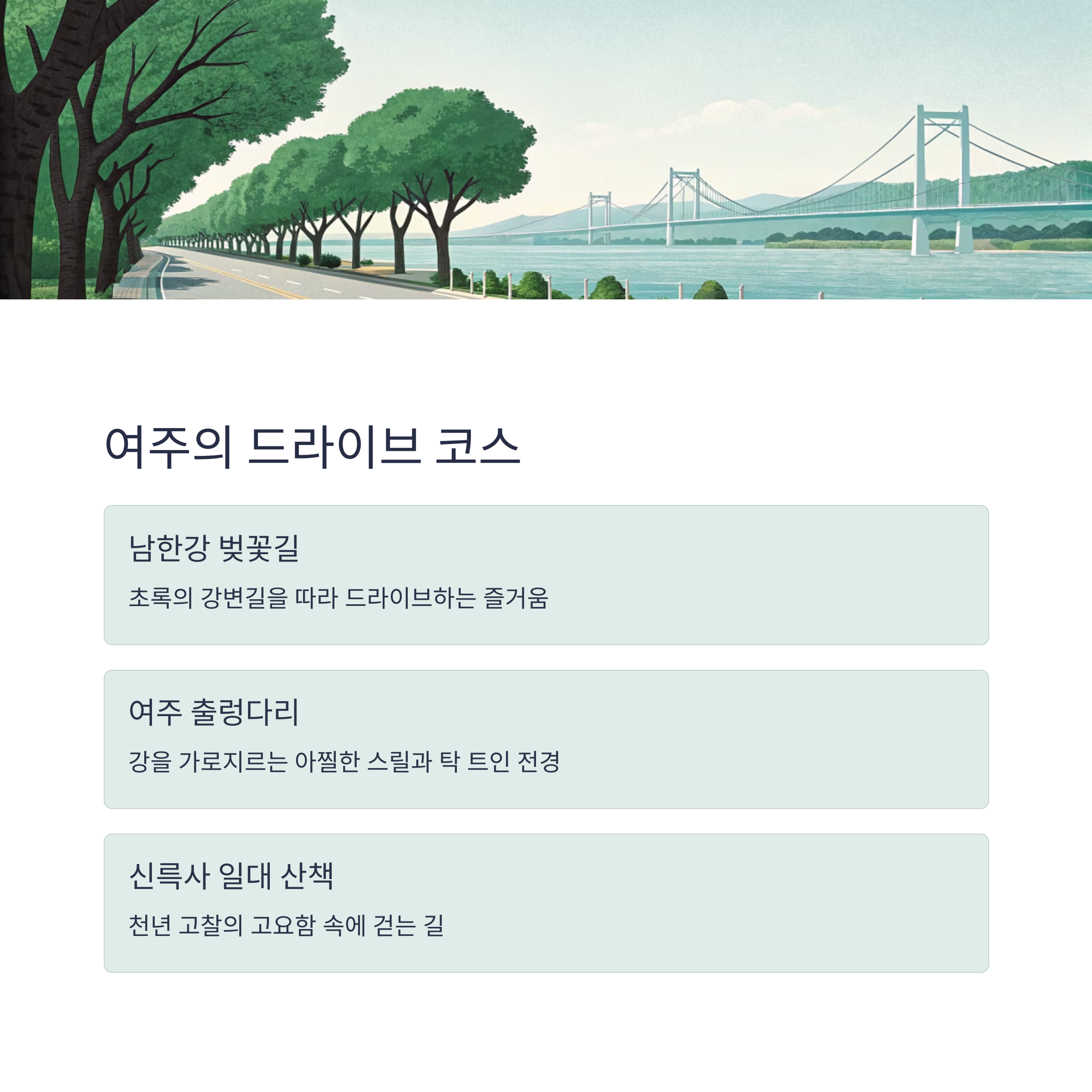 | 이동 추천 | 차량 필수, 여주 시내 및 강변 드라이브 적합 | 차량+도보 병행, 주요 관광지 간 접근성 우수 |