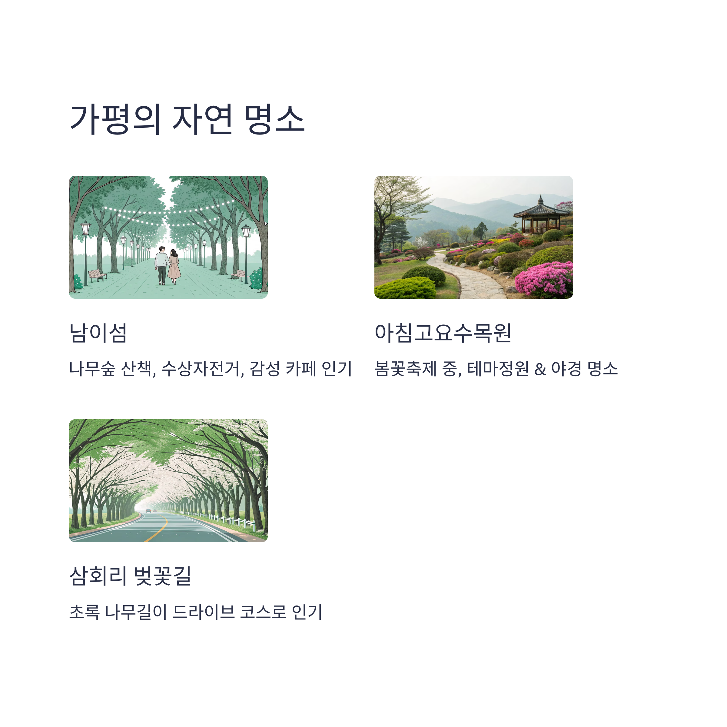 | 자연 명소 | 남한강, 신륵사, 출렁다리 | 남이섬, 아침고요수목원, 삼회리 벚꽃길 |