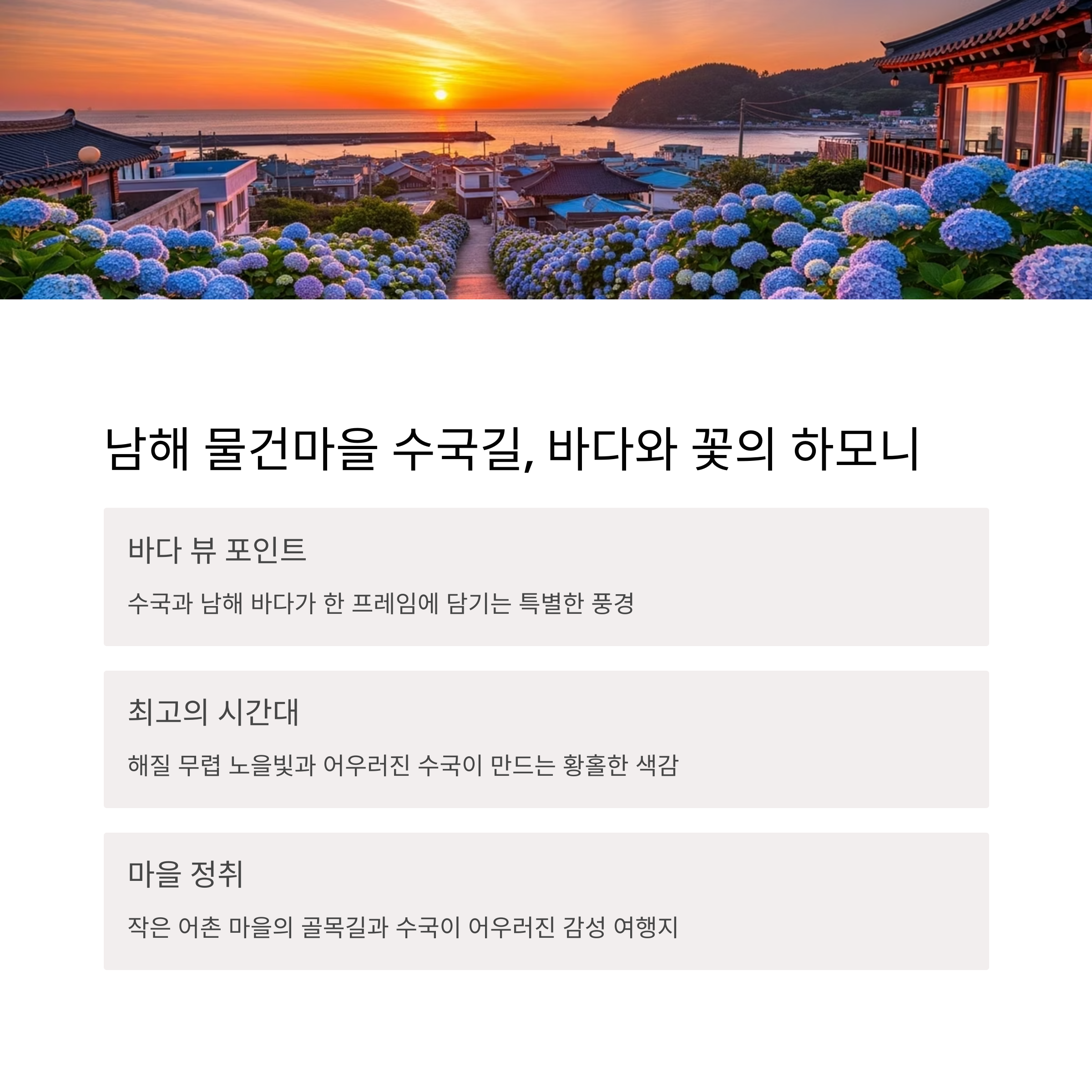 | 남해 물건마을 | 수국길과 바다가 어우러진 감성 명소 |