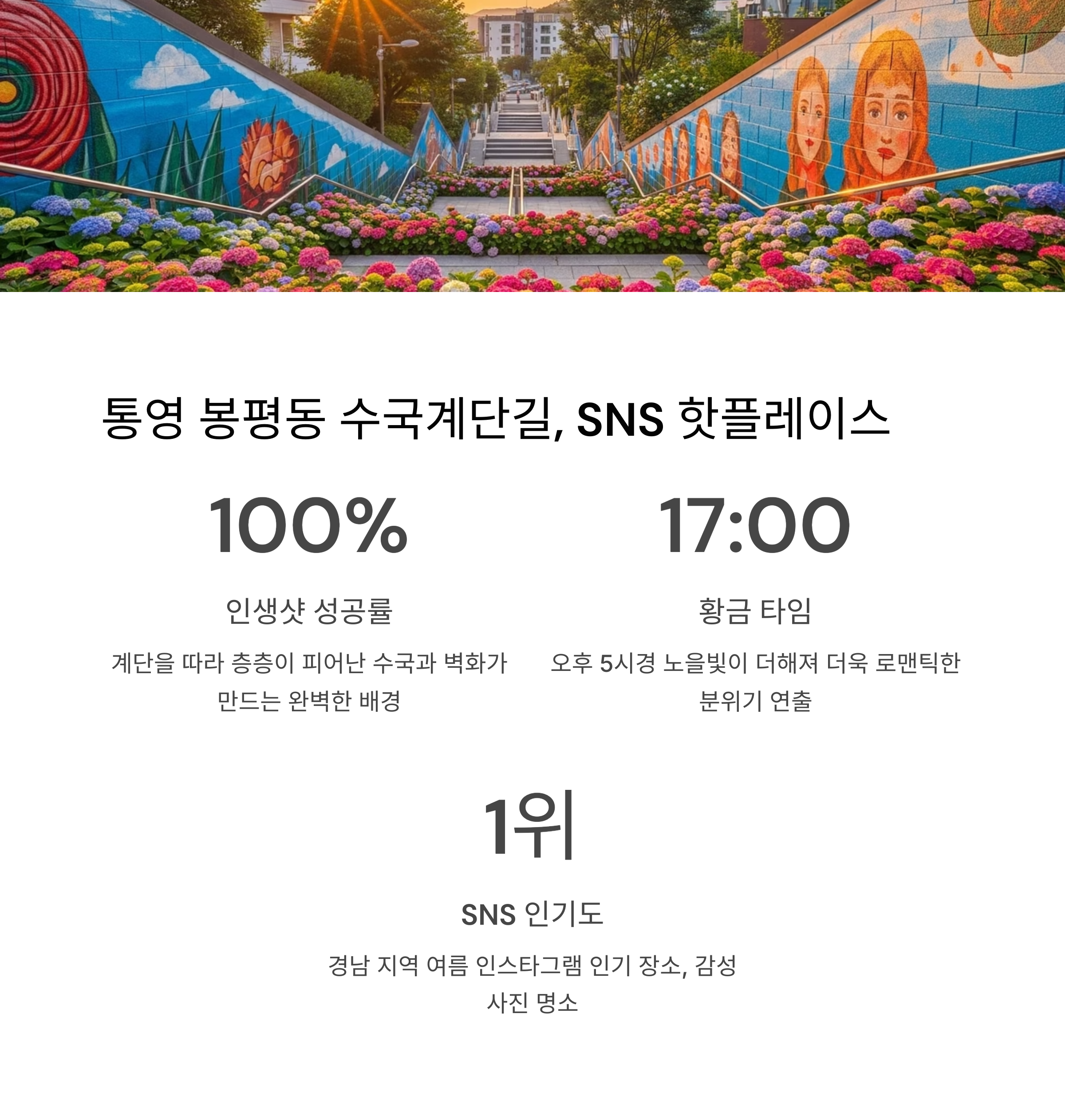 | 봉평동 수국계단길 | 벽화와 수국이 어우러진 포토존 | 오후 5시경 노을 타이밍 |