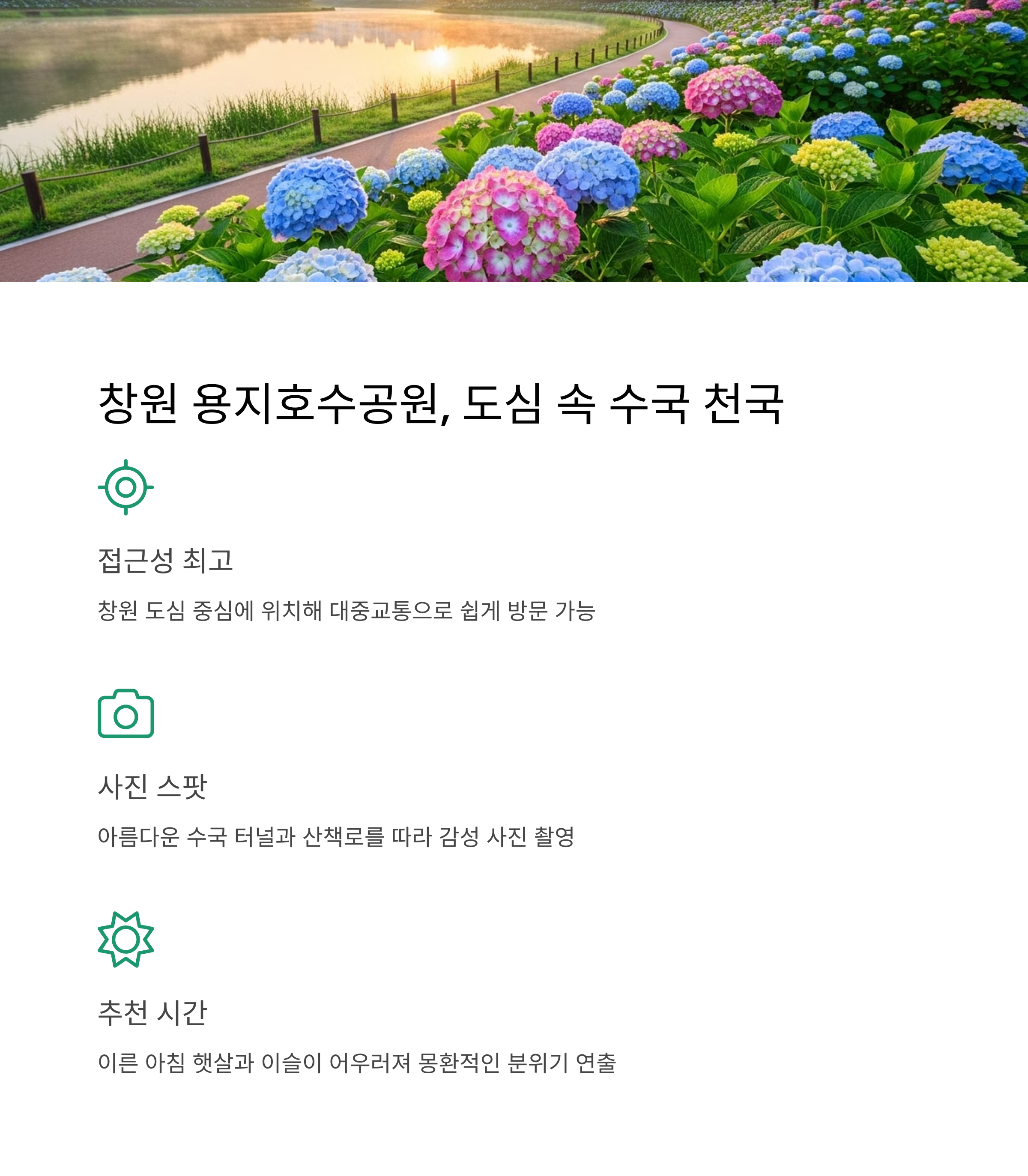 특히 해질 무렵에는 수국과 노을빛이 어우러져 최고의 포토존이 됩니다.